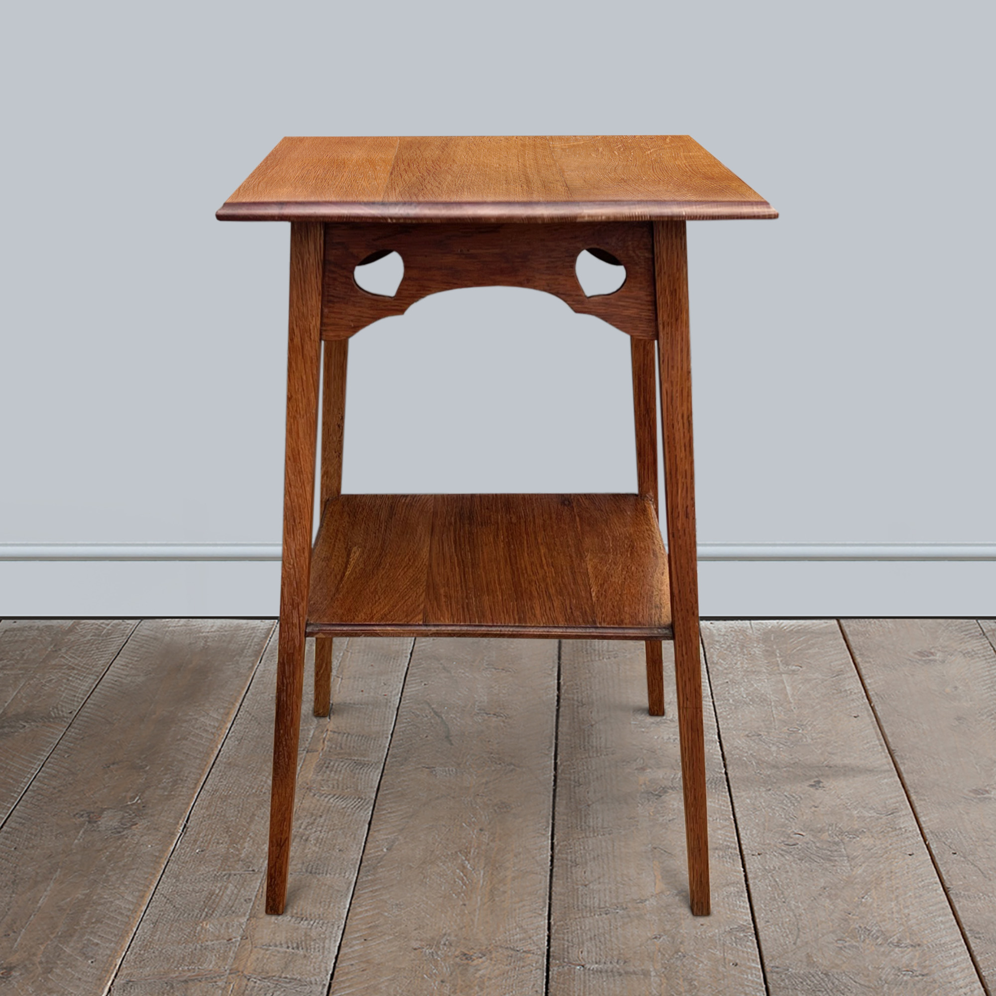 A near pair of tables with nicely moulded tops, which have pieced frieze below on all four sides of each table and are raised on four square splayed tapered legs with a very useful lower tier which could be used for books. You will find on one table on the underside of the lower tier the is an impressed number stamp of 4 9 3 from when it was manufactured and again the other table has an impressed number stamp 7 0 2 from when it was manufactured. These two beautiful tables are from the arts and crafts period and are dated circa early 20c.