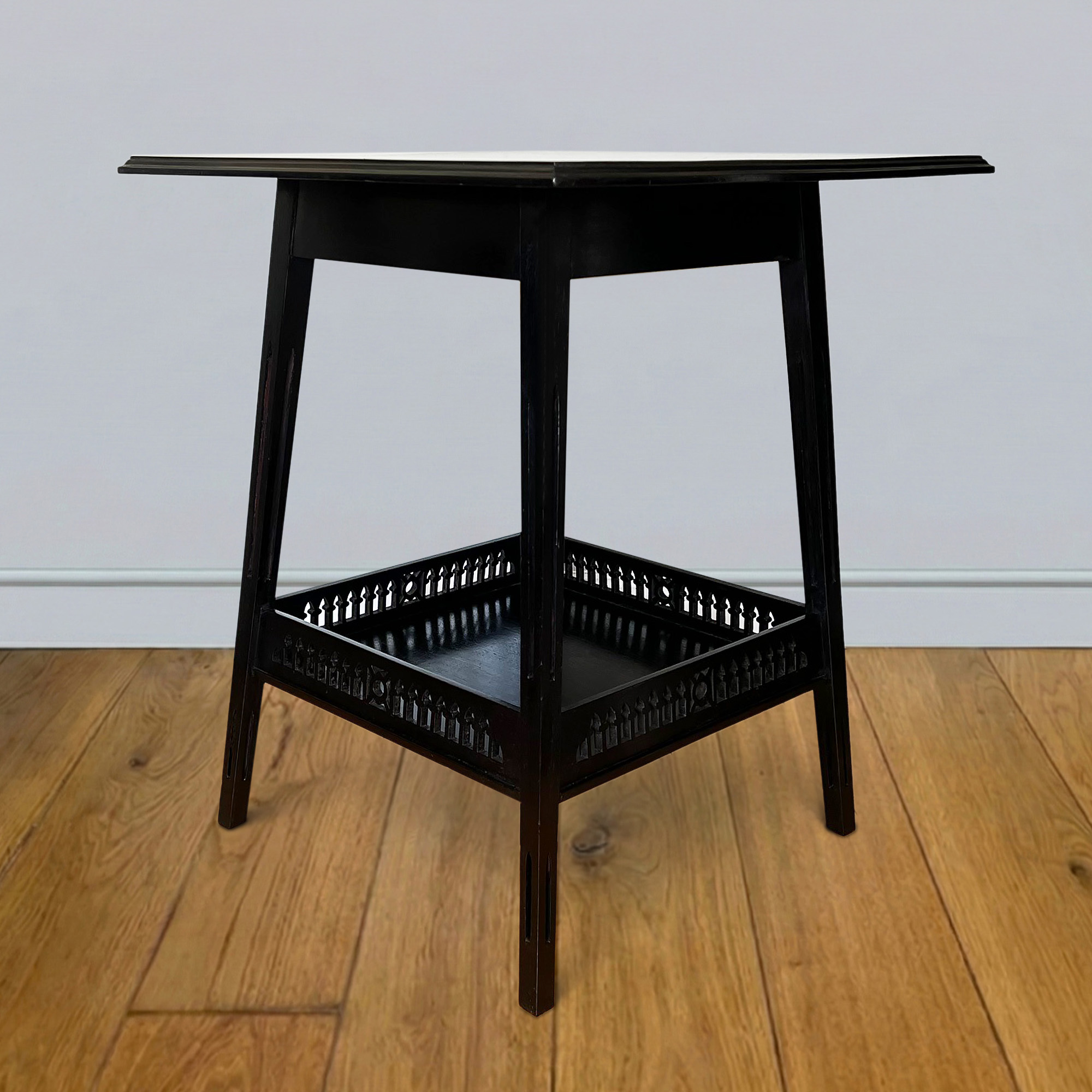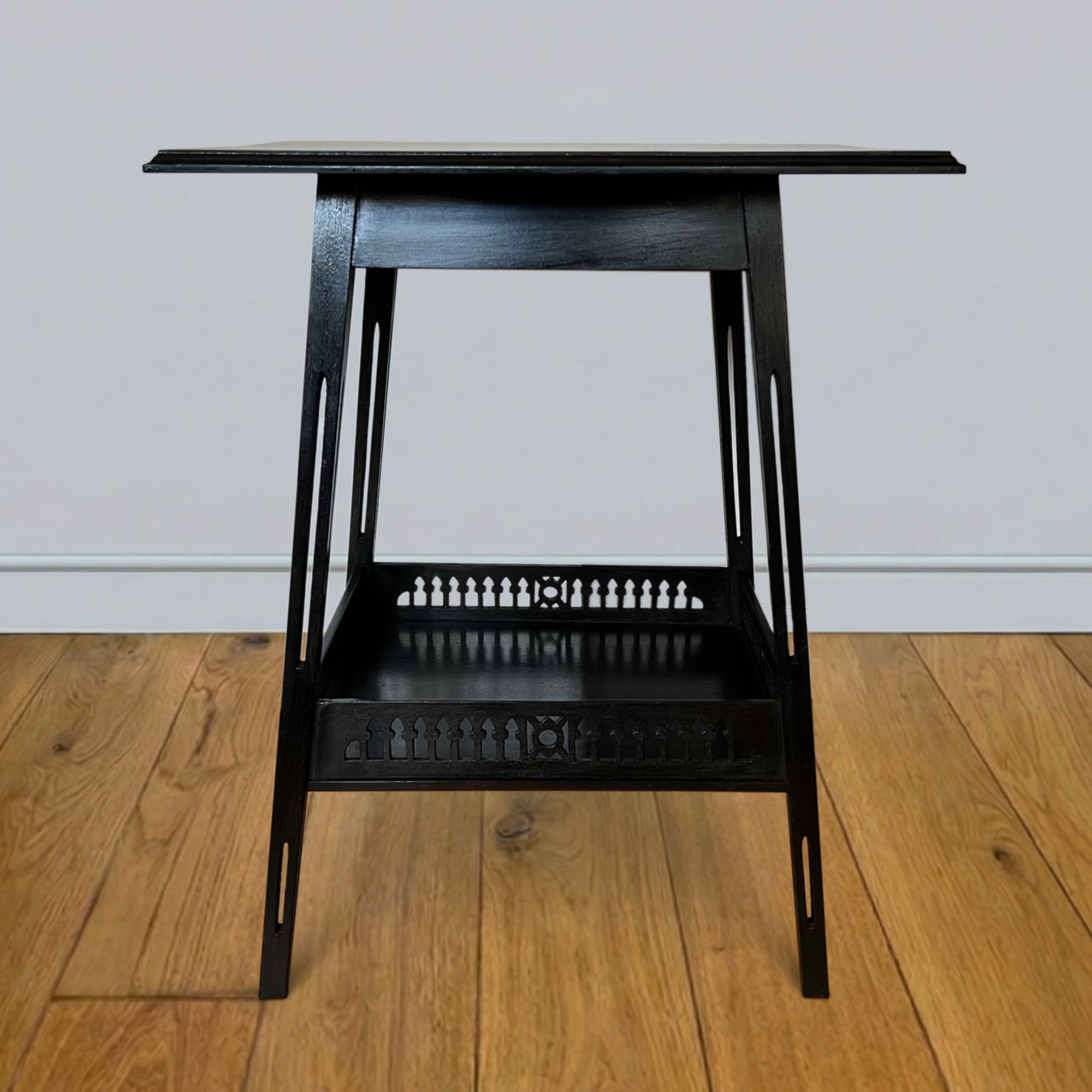 This good quality table has a square moulded top, which sits on four tapered splayed legs with gothic style open fretwork on each leg.